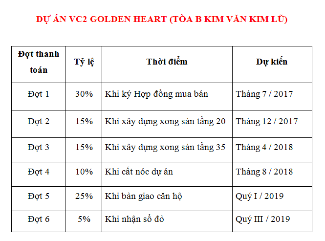 • Tiến độ đóng tiền của dự án VC2 GOLDEN HEART gồm 6 đợt.