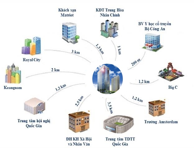 • Từ dự án có thể di chuyển dễ dàng tới các trung tâm phát triển của Hà Nội như: Trung tâm hội nghị Quốc gia, Siêu thị Big C, Tổ hợp thể thao Mỹ Đình, Trung tâm thương mại Grand Plaza…