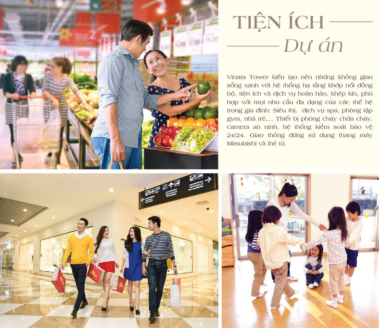 • Tổ hợp căn hộ Vinata Tower được xây dựng hướng tới một cuộc sống hiện đại tiện nghi sống cho cư dân trang bị với nhiều tiện ích hàng đầu của một khu chung cư cao cấp như: Trung tâm thương mại, Khu vui chơi giải trí, Phòng tập Gym, Fitness & Yoga, Trường mầm non, Bể bơi bốn mùa, Nhà hàng, Khu đọc sách,…