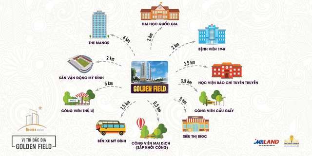 • Dự án Golden Field Mỹ Đình được thừa hưởng những tinh hoa của khu đô thị mới Mỹ Đình khi nằm cạnh những toà nhà cao tầng, các trung tâm thương mại hạng sang, giữa các trường học và bệnh viện uy tín.